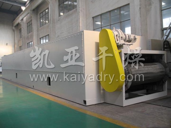 整個(gè)生產(chǎn)線為全封閉型(對物料而言),由擺動布料段、干燥段、出料段三部分組成。擺動布料段作用使海藻均勻分散在網(wǎng)板上,并且勻速輸送到干燥段,海藻經(jīng)過80℃熱風(fēng)干燥段,90℃熱風(fēng)干燥段和120℃熱風(fēng)干燥段后,再經(jīng)過出料段排料。循環(huán)風(fēng)向及各單元內(nèi)風(fēng)的循環(huán)為向下式,即加熱后的空氣由引風(fēng)機(jī)吸入,在風(fēng)機(jī)出風(fēng)口首先預(yù)分布再經(jīng)過孔板均風(fēng)后,熱風(fēng)從物料的下面向上(或從物料的上面向下)穿透物料層。
