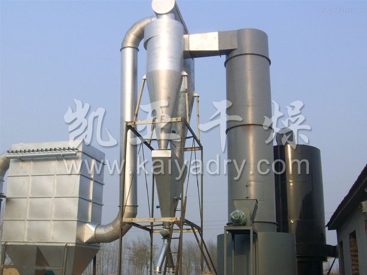 熱空氣由入口管以適宜的噴動速度從干燥機底部進入攪拌粉碎干燥室,對物料產生強烈的剪切、吹浮、旋轉作用,于是物料受到離心、剪切、碰撞、摩擦而被微?;瑥娀藗髻|傳熱。在干燥機底部,較大較濕的顆粒團在攪拌器的作用下被機械破碎,濕含量較低、顆粒度較小的顆粒被旋轉氣流夾帶上升,在上升過程中進一步干燥。由于氣固兩相作旋轉流動。固相慣性大于氣相,固氣兩相間的相對速度較大,強化兩相間的傳質傳熱.所以該機生產強度高。